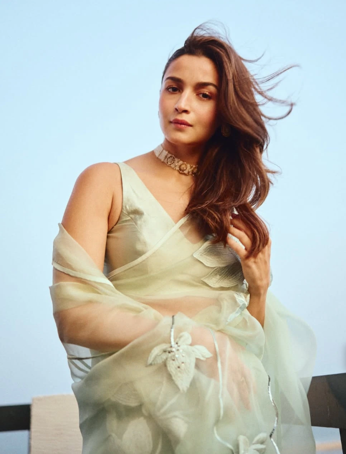 आलिया की साड़ी पर हाथों से खूबसूरत फूलों की कढ़ाई की गई है, जिसने इसे फ्रेश और नेचुरल लुक दिया. जब इस साड़ी पर सूरज की सुनहरी किरणें पड़ीं, तो इसका कलर और भी निखर कर गया. आलिया ने अपनी साड़ी के साथ डीप वी-नेक ब्लाउज पेयर किया, जो उनके लुक को क्लासी और स्टाइलिश बना रहा था. ब्लाउज की डीप-नेक उनके लुक को मॉडर्न टच दिया.