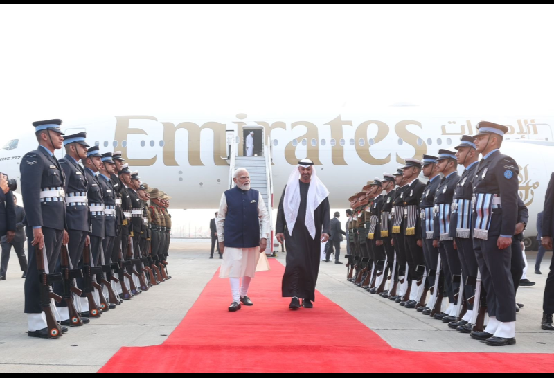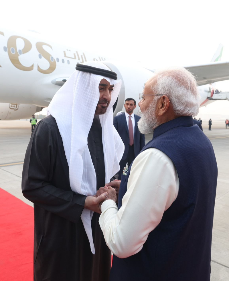 UAE: के राष्ट्रपति शेख मोहम्मद बिन जायद अल नाहयान सोमवार शाम करीब साढ़े 4 बजे नई दिल्ली पहुंचे। प्रधानमंत्री नरेंद्र मोदी ने राजनयिक प्रोटोकॉल से हटकर खुद पालम एयरपोर्ट पहुंचकर उनका स्वागत किया। राष्ट्रपति बनने के बाद शेख मोहम्मद बिन जायद का यह तीसरा भारत दौरा है, जबकि पिछले दस वर्षों में यह उनका पांचवां भारत आगमन है।