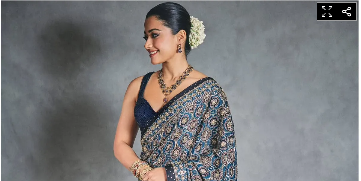 साउथ और बॉलीवुड एक्ट्रेस रश्मिका ने ब्लू कलर की डिजाइनर साड़ी और ब्लाउज के साथ रिंग्ज, कड़े, हैवी नेकलेस, ईयररिंग्ज और गजरे को कैरी किया है।